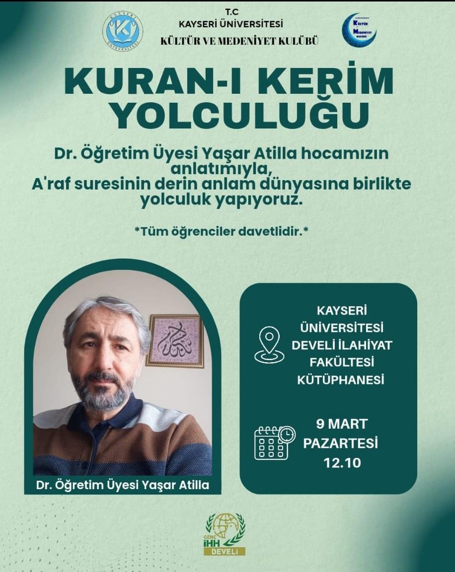 Fakültemiz bünyesinde faaliyet gösteren "Kültür ve Medeniyet Kulübü" tarafından öğrencilerin katılımına açık bir söyleşi programı düzenlendi. “Kur’an-ı Kerim Yolculuğu” başlığıyla gerçekleştirilen etkinliğin konuğu, Fakültemiz Öğretim Üyesi Dr. Öğr. Üyesi Yaşar Atila oldu. Etkinlikte "A’râf Suresinin Derin Anlam Dünyasına Birlikte Yolculuk Yapıyoruz" teması çerçevesinde Kur’an-ı Kerim’in derin anlam dünyası ele alındı.