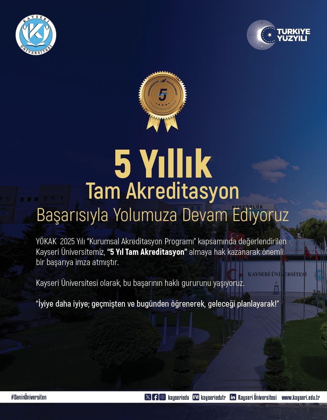 Üniversitemiz, Yükseköğretim Kalite Kurulu (YÖKAK) tarafından yürütülen Kurumsal Akreditasyon Programı kapsamında gerçekleştirilen değerlendirme sürecini başarıyla tamamlayarak 5 yıllık tam akreditasyon almaya hak kazandı.