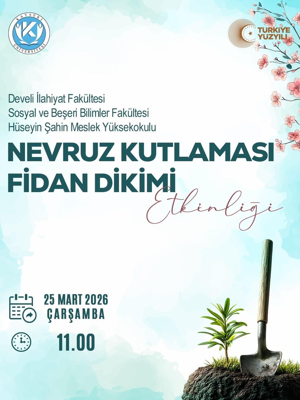 Kayseri Üniversitesi Seyrani Kampüsü’nde, Nevruz Bayramı dolayısıyla düzenlenen “Nevruz Kutlaması ve Fidan Dikimi Etkinliği” büyük bir coşku ve katılımla gerçekleştirildi. Develi İlahiyat Fakültesi, Develi Sosyal ve Beşeri Bilimler Fakültesi ile Develi Hüseyin Şahin Meslek Yüksekokulu’nun katkılarıyla düzenlenen etkinlikte, baharın gelişi çeşitli geleneksel etkinliklerle kutlandı.