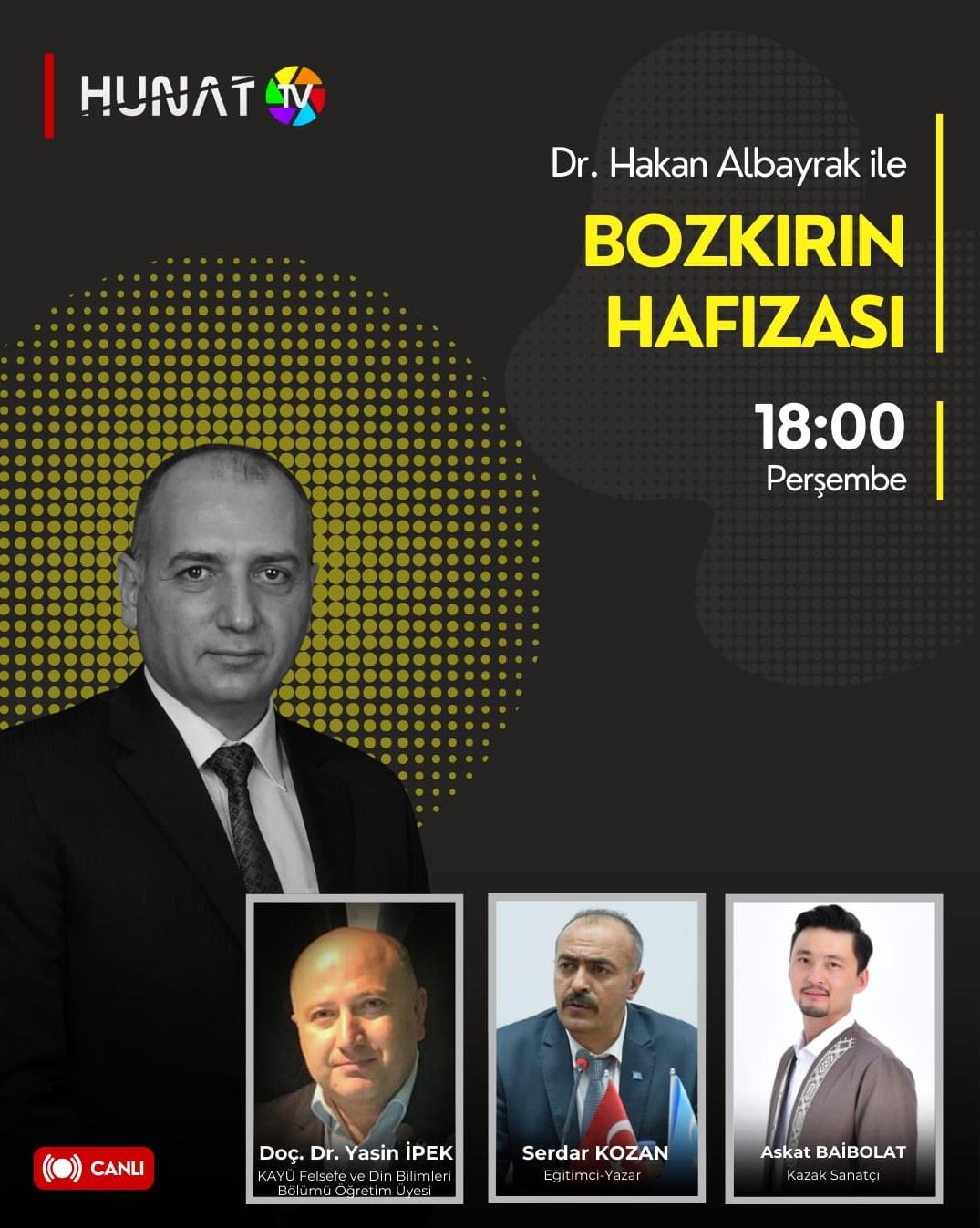 Fakültemiz Felsefe ve Din Bilimleri Bölüm Başkanı Doç. Dr. Yasin İPEK, Hunat TV ekranlarında yayınlanan “Bozkırın Hafızası” programına konuk oldu. Program, Dr. Hakan ALBAYRAK’ın sunumuyla 26 Mart 2026 Perşembe günü saat 18.00’de canlı olarak izleyiciyle buluştu.