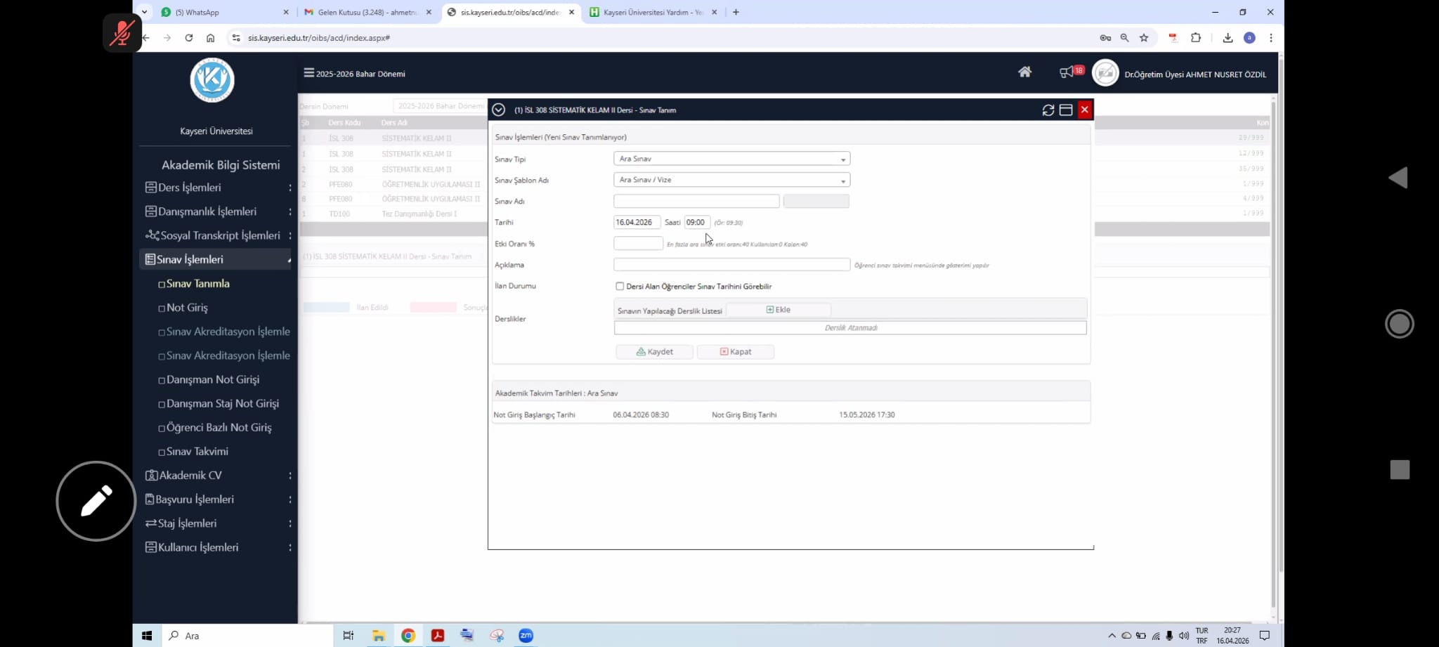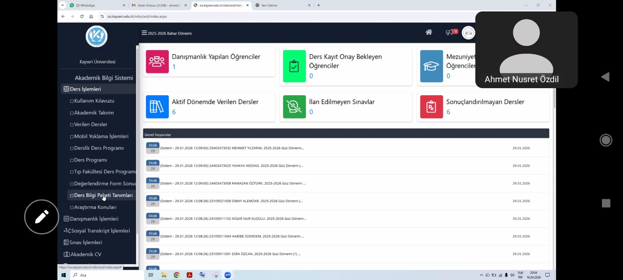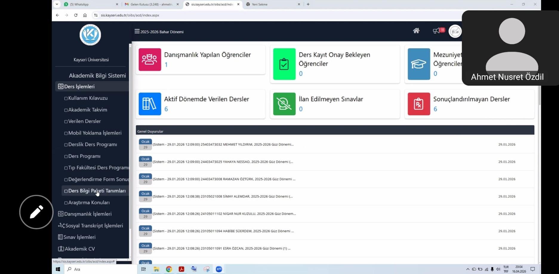 Fakültemiz Dekan Yardımcısı Dr. Öğr. Üyesi Ahmet Nusret Özdil tarafından verilen “2025-2026 Güz Dönemi Ders Dosyalarının Hazırlanması” konulu eğitim, 16 Nisan 2026 tarihinde saat 20.00’de çevrimiçi (online) olarak yapıldı.